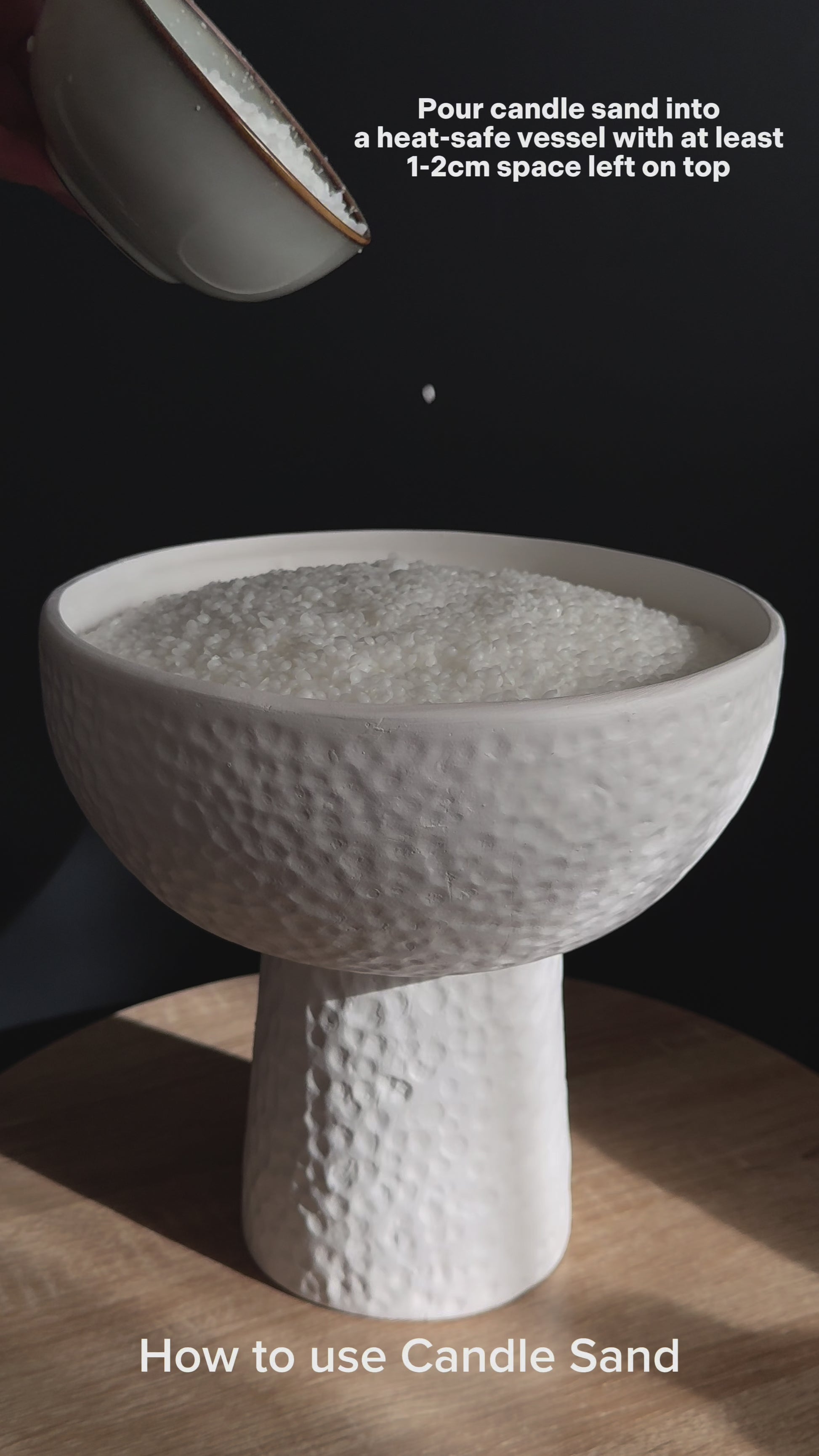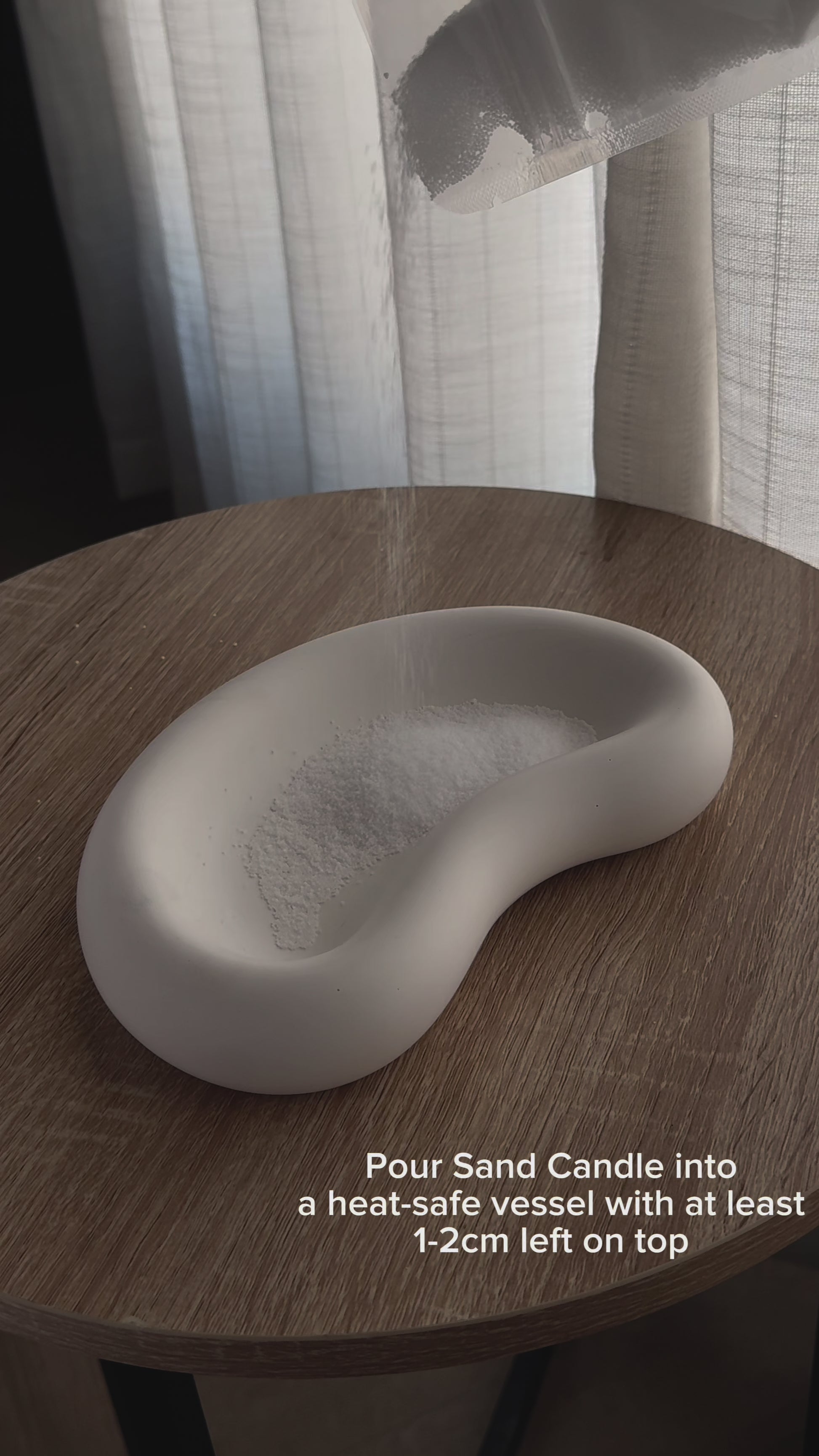 Using the ribbed dish heat-resistant container that comes with this kit pour in the 54g of Sand Candle that comes with the kit. Trim and insert the wick from the kit so that it extends about 1 cm above the container. Drop 1-2 drops of the fragrance about 2cm away from the wick before you light the wick. Once everything's set, light the candle and enjoy the glow. When the wick burns down, simply reuse it by flipping it and the solid wax upside down and light it up again.